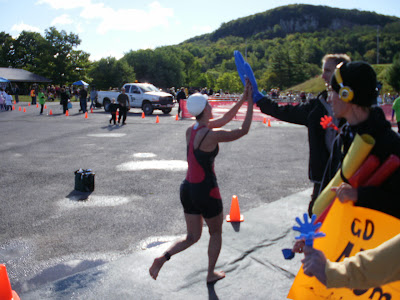 This was a last minute unplanned event. Mrs. Lord of the Chainrings had properly trained for the Peterborough sprint triathlon way back in July however the weeks leading up to this weekend contained little more than a few workouts. The gameplan was to show up and suffer. Upon arrival you could tell this was a woman's event for sure. As Fran was racking her bike in the transition area the announcer came on the loudspeaker and was asking people to remove the buckets of water from the transition area as only race-necessities were allowed. I'm guessing the buckets of water were for cleaning off the feet or something? I was surprised they said something as you could clearly see athletes setting up hair dryers, powder stations with mirrors and nail polishing. Coming out of the water means all the makeup would fall off, so I guess they wanted to look good for the cameras. We needed to use same day registration and I can tell you this was poorly organized. One volunteer told you to do one thing, while the other contradicted. Communication and signage was poor. We took it in strides and had some fun with it. The whole 'expect the unexpected' attitude only works for me when I'm just a spectator. If I was Fran, I wouldn't have been so calm as race day usually gets me all wound up and I get short fused. Body marking was interesting. They didn't put your age on the calf, they put a letter for your category. Even though this is because some ladies are sensitive about their age, I couldn't help but roll my eyes at this one. At least the race organizers were making an effort I guess. Not enough of an effort though, as I'm pretty sure they broke a rule by assigning WHITE swim caps. I mean seriously, if that doesn't scream condom-head I don't know what will. White should be outlawed as it is fugly. They had both pink AND salmon colour which looked the same to me, so I'm guessing a few noobs were lost at swim start for sure. We got to meet Adena , also known as "Anita", for the first time. She looks nothing like the little profile picture on her blog so I wouldn't have recognized her at all! She asked me not to haggle her too much during the event so I took that as an open invitation to lay it on thick. Maybe we could even make her cry? :) So at swim start I noticed Fran was only 'half wet'. She didn't bother to do a swim warm up. Her theory was to get into the water for a few minutes, get out and then when you re-enter, the water should feel warmer. Well, I'm pretty sure that's not what they mean when they talk about a swim warm-up but whatever. It's her race, so I'm not going to say anything lol. About 30 seconds to start there was a woman freaking out because her 'guy' wasn't there with her. I didn't understand until they were pointing and waving at a lifeguard kayaker in the distance who was shadowing a weak swimmer. Apparenlty she struck a deal to have a lifeguard follow her in the kayak but he was obviously pre-occupied with someone else that was getting the same service. He shook his head as to say no and pointed at the weak swimmer which clearly needed the assistance at the end of her split alot more than the lady who was about to start her race. Regardless, the lady was panicing over not having a kayak guide her. While we all get apprehenisve about the swim, it should be written somewhere that if you feel you NEED a dedicated kayak, then you're NOT ready and should try a shorter race. Again, kudos to race organizers for the extra touches for noob athletes. This event was catered specifically to just that which is awesome. Waiting for Fran to finish her swim was fun. I made an effort to make sure our 'cheer squad' was the loudest there. We had our plastic hand-clappers, Go-Mommy signage, inflatable clap-sticks, inflatable big blue hand high-five gloves. What I didn't anticipate was that we were the only people cheering. T1 was dead quiet, and the announcer kept trying to get people to clap or anything but everyone was just too much of a prude to have fun. Fran's swim was a little slower than expected, but was plenty respectable. She looked fresh coming out of the water and didn't have the red-panic-face that many others had. T1 exit was interesting as you seen everything from mountain bikes, hybrid bikes, oldschool steel bikes and the sort heading out. Fran was worried about not looking the part with her classic steel road bike, but she felt much better once she seen what the competition had. Going into T2 was funny. Among the leaders were ladies on hybrids and mountain bikes and they were leading the women on expensive tri-bikes. That is pure awesome, I love seeing that. We decided to walk up the run course to setup our cheering section and wait for mom. We were on a hill so we got to cheer athletes on that were struggling with the climb. It was great! We got a fair bit of high-fives in and people seem to really appreciate the extra support on the tough run. People would run past us but then start walking. I would get out of my chair, run up the hill past them and then put out the high-five hand and clapper. This would get them running again. I had alot of fun motivating people, the best part was the vast majority all had smiles. There was next to no serious tri-dork snobbery going on. Fun! It was at this time that a coach looking woman was repeatedly pacing athletes up the hill. That's when I learned that she was part of the mommys-in-motion group and secondwind conditioning that Adena was part of. They had something like 30 athletes there and the coach was helping people along. That was great that she was there doing this, it looks like a really awesome group that Fran would enjoy. I keep saying Fran should get a yummy-mummy race team going one day. The coach would tell me the names of the ladies approaching us and we would cheer them on by name. Then she said Adena's name and that's when I realized I've been calling her Anita all this time! Oh no! I had to pull out my phone to check my emails a